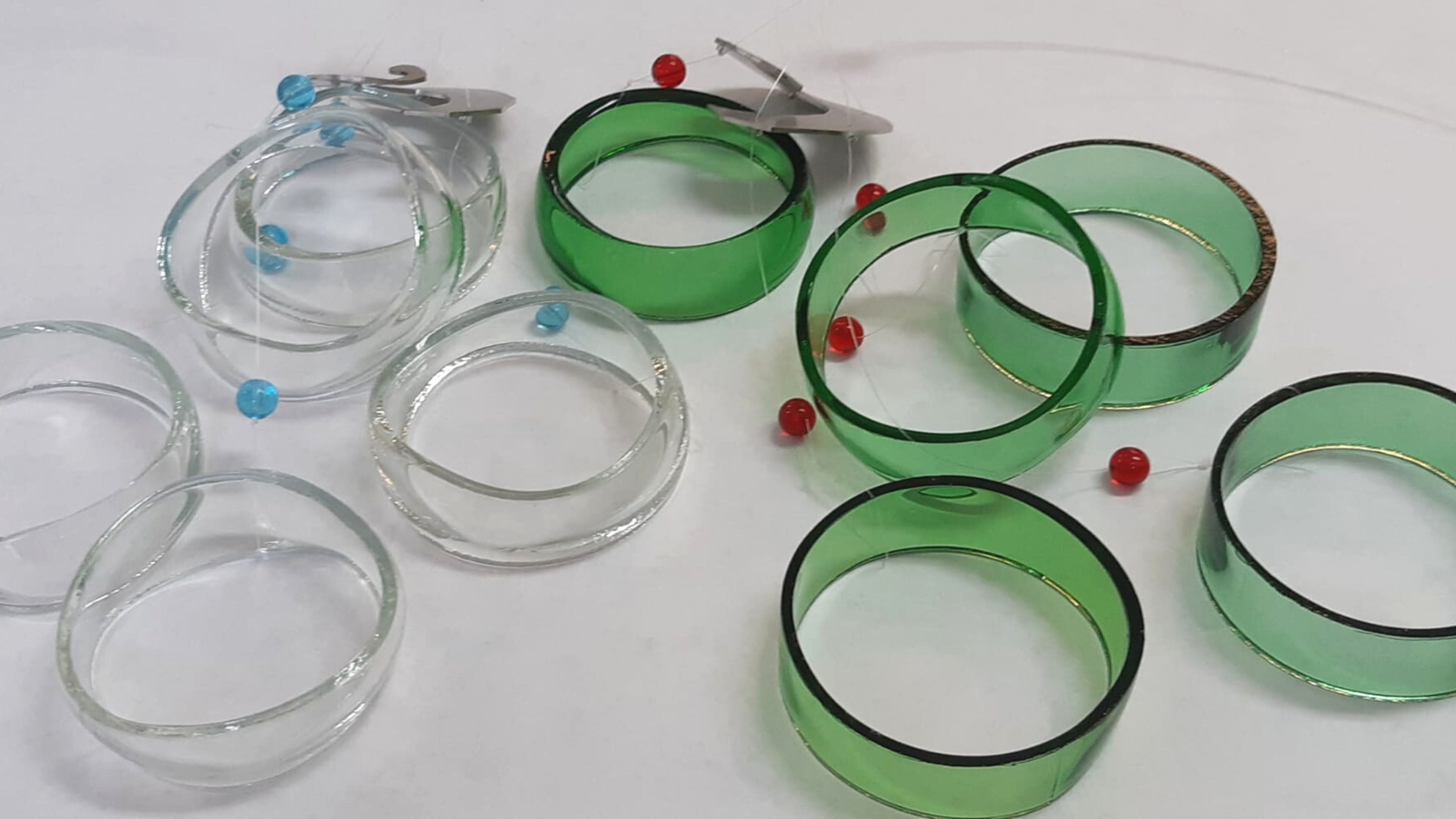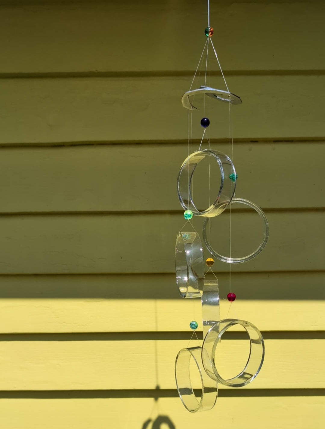 Our breeze chimes begin as glass bottles, which we carefully cut into rings. These glass rings are cleaned and kiln-fired to soften the edges and reveal their natural shine. Once cooled, each piece is knotted, assembled, and arranged by hand onto its stainless steel harness. A one-of-a-kind chime that carries both craft and character.